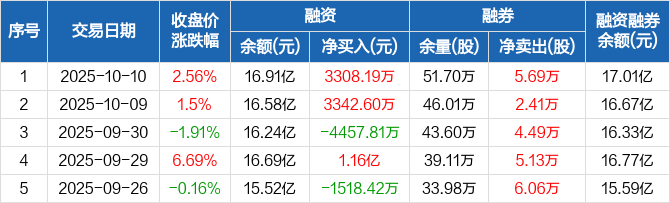 融资方面,当日融资买入1.53亿元,融资偿还1.2亿元,融资净买入3308.19万元。融券方面,融券卖出6.3万股,融券偿还6100股,融券余量51.7万股,融券余额1076.91万元。融资融券余额合计17.01亿元。
