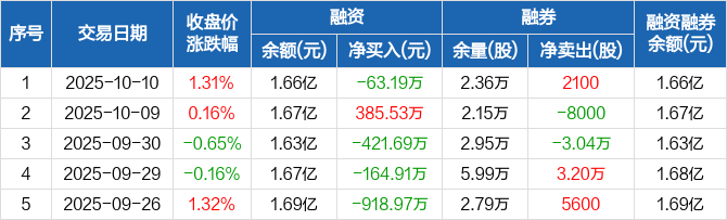 融资方面,当日融资买入764.62万元,融资偿还827.81万元,融资净偿还63.19万元。融券方面,融券卖出4600股,融券偿还2500股,融券余量2.36万股,融券余额14.58万元。融资融券余额合计1.66亿元。