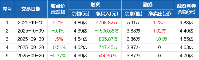 融资方面,当日融资买入1.21亿元,融资偿还7340.74万元,融资净买入4768.82万元。融券方面,融券卖出1.28万股,融券偿还500股,融券余量5.11万股,融券余额161.02万元。融资融券余额合计4.88亿元。
