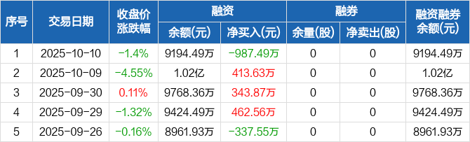 融资方面,当日融资买入714.1万元,融资偿还1701.59万元,融资净偿还987.49万元。融券方面,融券卖出0股,融券偿还0股,融券余量0股,融券余额0元。融资融券余额合计9194.49万元。