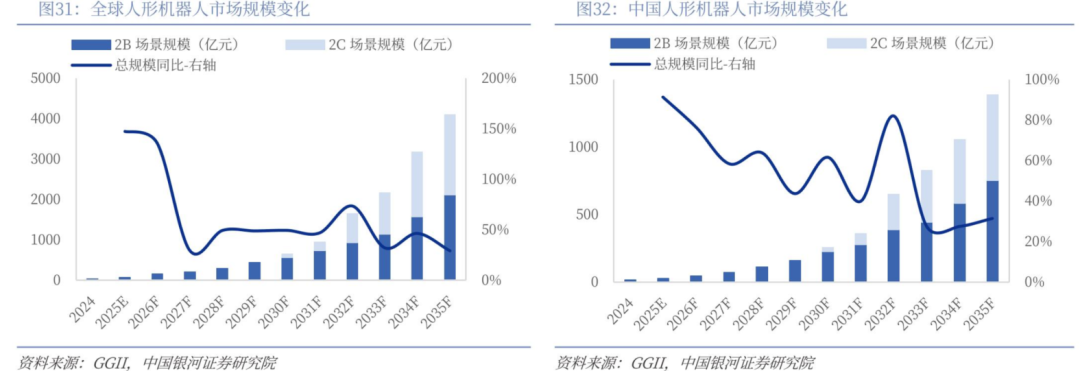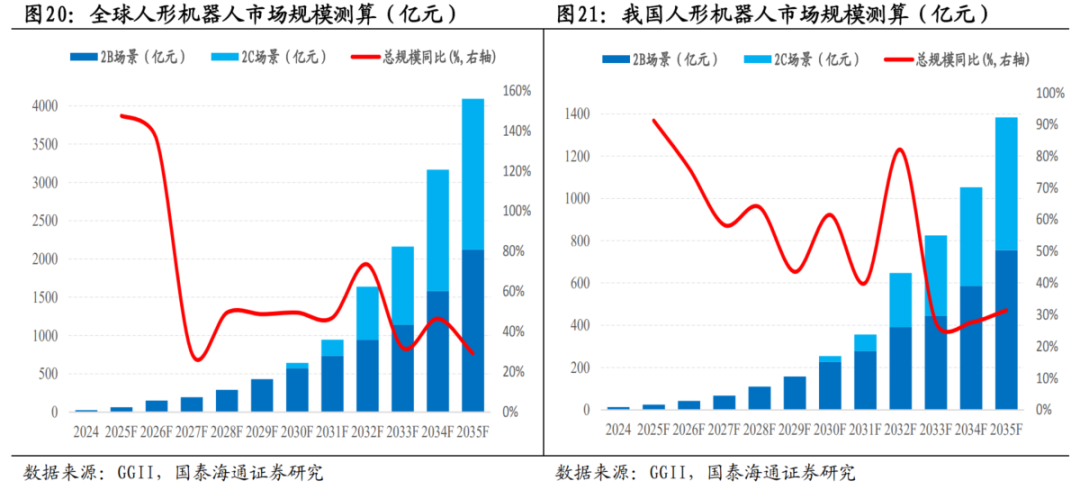 据 GGI 预测,2025 年全球人形机器人市场销量有望达到 1.24 万台,市场规模 63.39 亿元,到 2030 年全球人形机器人市场销量将接近 34万台,市场规模将超过640亿元。预计到 2031年,我国人形机器人进入快速起量期,到2035 年销量有望达到200万台左右,市场规模有望接近 1400 亿元。