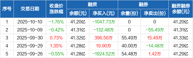 融资方面,当日融资买入4077.98万元,融资偿还5125.71万元,融资净偿还1047.73万元。融券方面,融券卖出0份,融券偿还0份,融券余量0份,融券余额0元。融资融券余额合计41.2亿元。