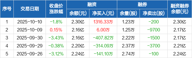 融资方面,当日融资买入2552.04万元,融资偿还1235.71万元,融资净买入1316.33万元。融券方面,融券卖出200股,融券偿还400股,融券余量1.23万股,融券余额24.21万元。融资融券余额合计2.3亿元。