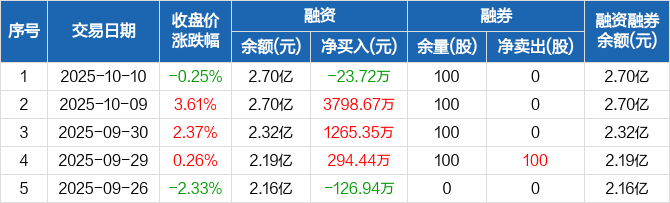 融资方面,当日融资买入1916.51万元,融资偿还1940.23万元,融资净偿还23.72万元。融券方面,融券卖出0股,融券偿还0股,融券余量100股,融券余额401元。融资融券余额合计2.7亿元。