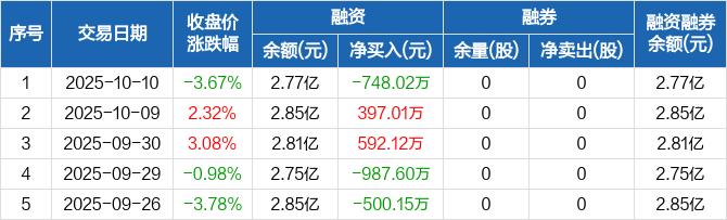 因赛集团:融资净偿还748.02万元,融资余额2.77亿元(10-10)