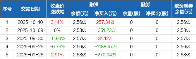 融资方面,当日融资买入953.1万元,融资偿还695.76万元,融资净买入257.34万元。融券方面,融券卖出0股,融券偿还0股,融券余量0股,融券余额0元。融资融券余额合计2.56亿元。