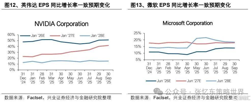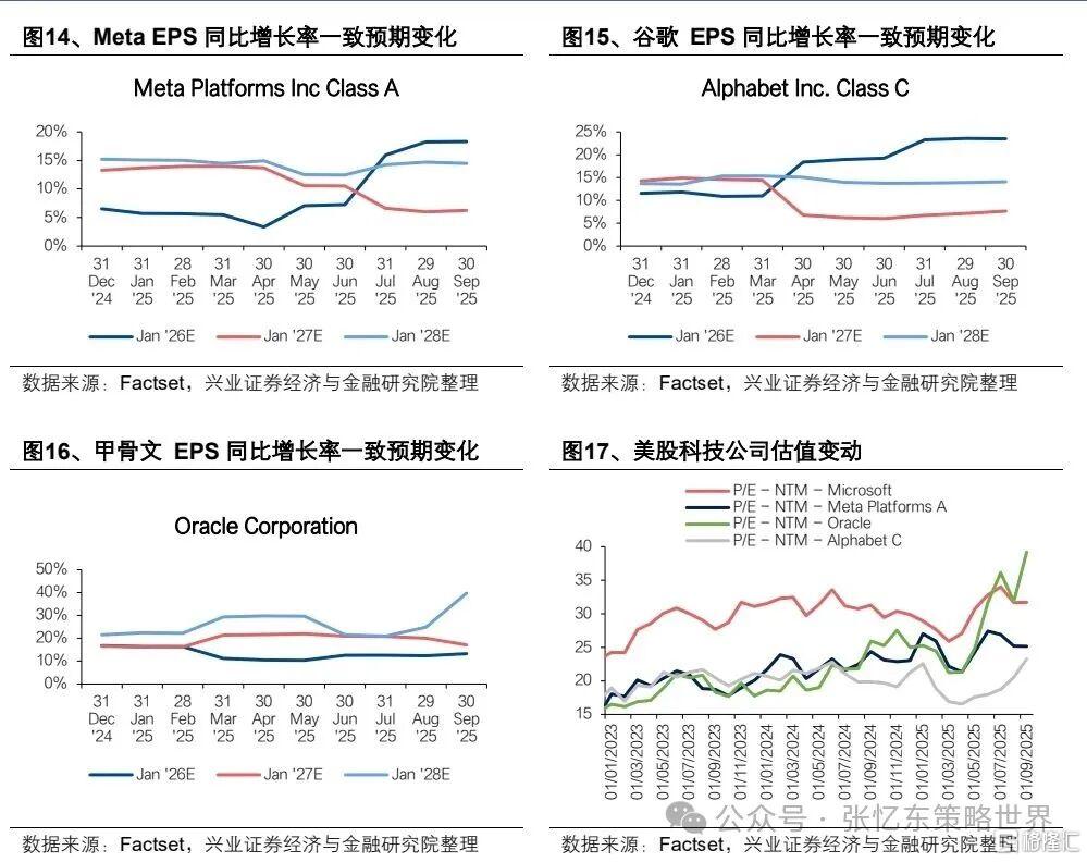 美股AI龙头企业的盈利增速预期提升,驱动估值抬升,引领美股持续走牛。相较于2024年底,截止2025年9月30日,英伟达2027财年预测EPS同比增速从23%提升到42%;甲骨文2028财年EPS预期增速从22%提升到40%;Meta 2026财年EPS预期增速从7%提升到18%。相应,当前甲骨文、Meta的动态PE从过去20倍以下的水平分别提升到了42倍和25倍。