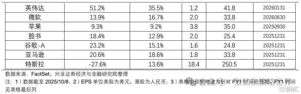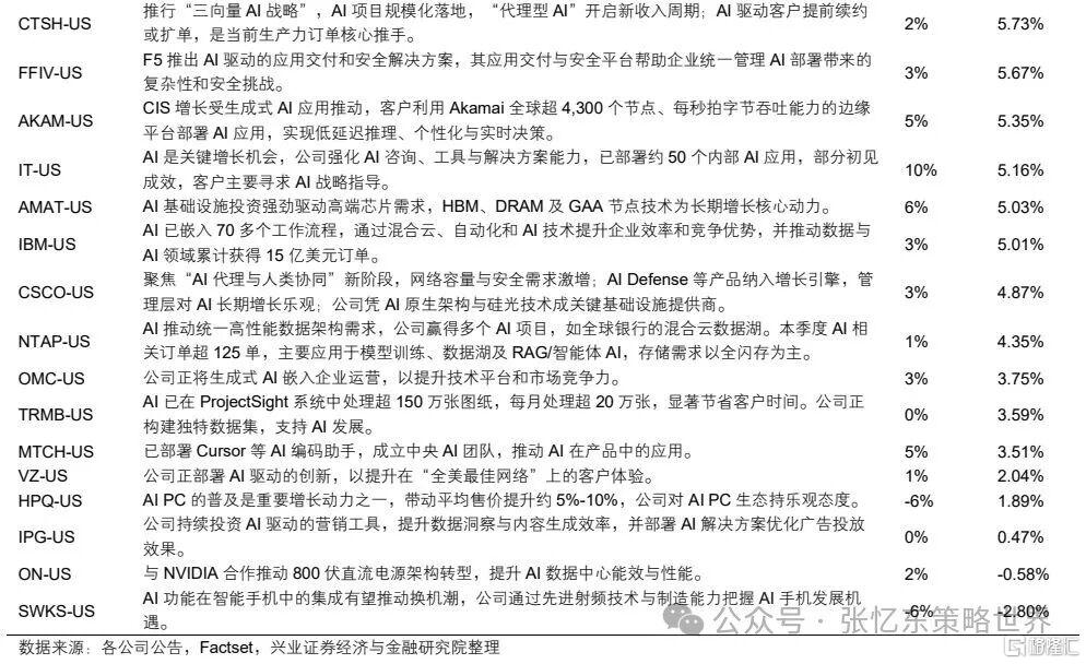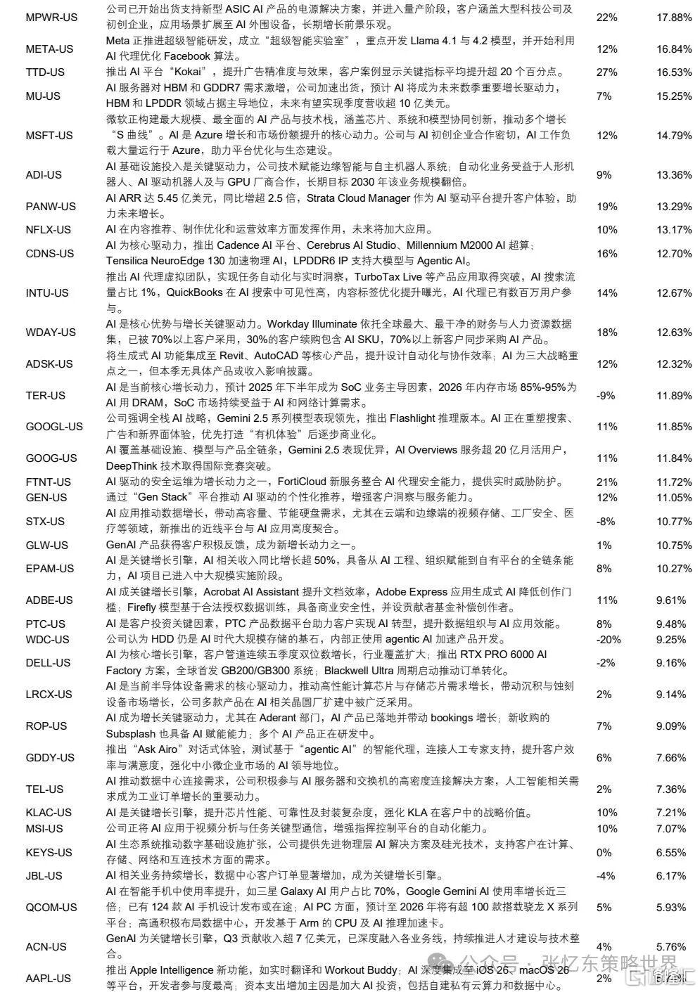 2025 年二季度财报季,标普 500 指数中已有60家TMT公司在财报或业绩会中明确表示 AI 对其业务产生了实质性驱动。整体来看,在AI的驱动下,这些公司的收入复合年增长率有望从过去的个位数增长,提升至双位数增长,过去三年实际的复合年收入增长率8.0%,而未来三年整体收入复合年增长率的一致预期达到约12.3%。
