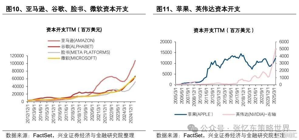 自2023年ChatGPT取得突破性进展后,美股行情聚焦AI,以微软、英伟达、Alphabet、Meta等为代表的龙头公司纷纷加大资本开支。截止2025年二季度,英伟达的资本开支较2023年同期增加了2倍,微软增加了130%,Alphabet 增加了139%,Meta增加了66%。