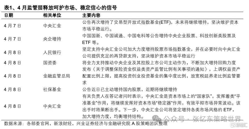 尤其是4月7日特朗普对全球加征所谓“对等关税”资本市场剧烈震荡之时,监管层迅速行动释放出呵护市场、稳定信心的明确信号。中央汇金、社保基金增持;央行表示坚定支持中央汇金公司加大力度增持股票市场指数基金,并在必要时向中央汇金公司提供充足的再贷款支持;金融监管总局上调保险公司权益资产配置比例上限。