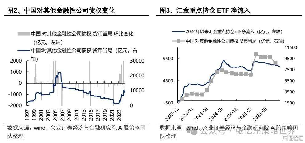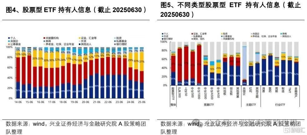“有形之手”努力提振资本市场,中期资金加速入市。近年来,证金、汇金等国资机构以及险资等中长期资金对股票型ETF的配置持续增加,已成为ETF的重要持有人。截至25H1,根据已披露的股票型ETF持有人信息,个人投资者占比为30.9%,而机构投资者占比为69.1%,较24年末提升2.5%。机构投资者中,随着上半年证金、汇金大量增持ETF维稳市场,其持有比例从24年末的33.0%进一步提升至25H1的37.2%。此外,险资、央国企也是股票ETF的重要持有人。