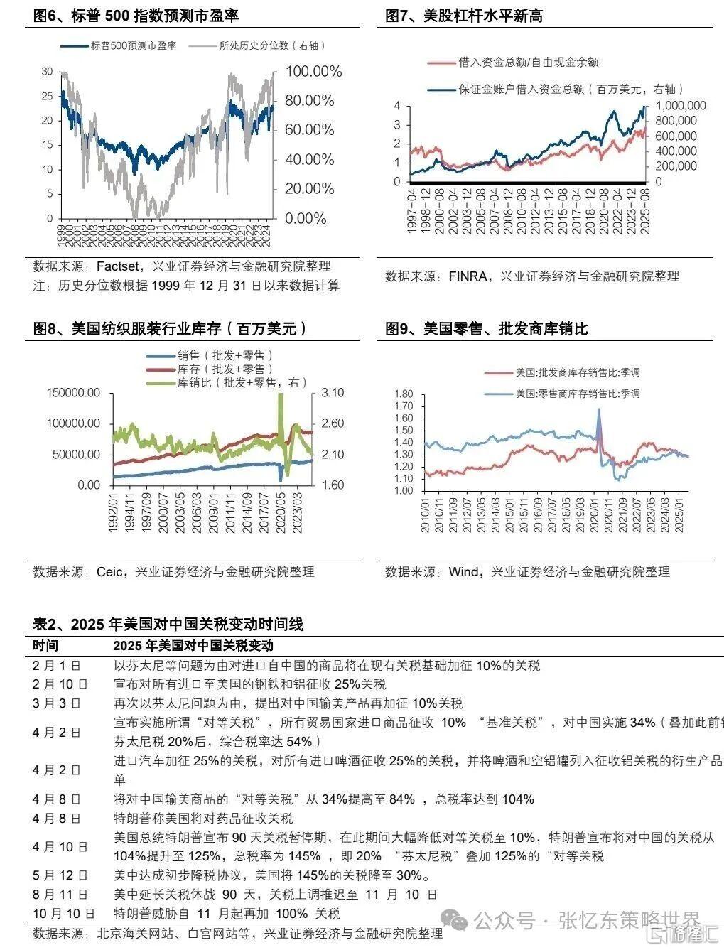 相较于4月份的上一轮关税威胁,当前地缘政治博弈的格局已发生显著变化,美国内部压力倍增。1)政治困局深化:美国当前面临政府“关门”、两党内斗白热化等多重内部政治危机,其决策环境较四月份更为混乱与脆弱。2)缺乏库存保护垫,潜在通胀传导风险高于4月。3)金融市场对负面冲击的敏感度更高:美股估值水平更高,标普500指数预测市盈率处于1999年底以来96%分位数以上;市场杠杆率也更高,保证金账户借入资金总额与自由资金余额的比值达到1997年以来的最高值。币圈也从高位下跌。