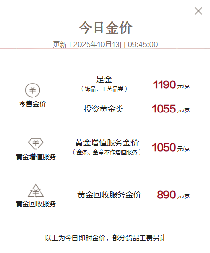 10月13日,黄金早盘继续冲高,并创历史新高。受国际金价影响,国内金店金饰克价突破1190元。其中,周大福金价由前一日的1180元/克上调至1190元/克;周生生金价由前一日的1176元/克上调至1188元/克;老庙黄金金价由前一日的1183元/克上调至1189元/克。