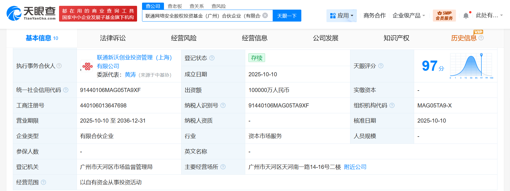 南方财经10月13日电,天眼查App显示,近日,联通网络安全股权投资基金(广州)合伙企业(有限合伙)成立,执行事务合伙人为联通新沃创业投资管理(上海)有限公司,出资额10亿人民币,经营范围为以自有资金从事投资活动。合伙人信息显示,该基金由中国联通旗下联通战新私募股权投资基金(武汉)合伙企业(有限合伙)、联通创新创业投资有限公司、联通新沃创业投资管理(上海)有限公司及上海国泰君安创新股权投资母基金中心(有限合伙)等共同出资。