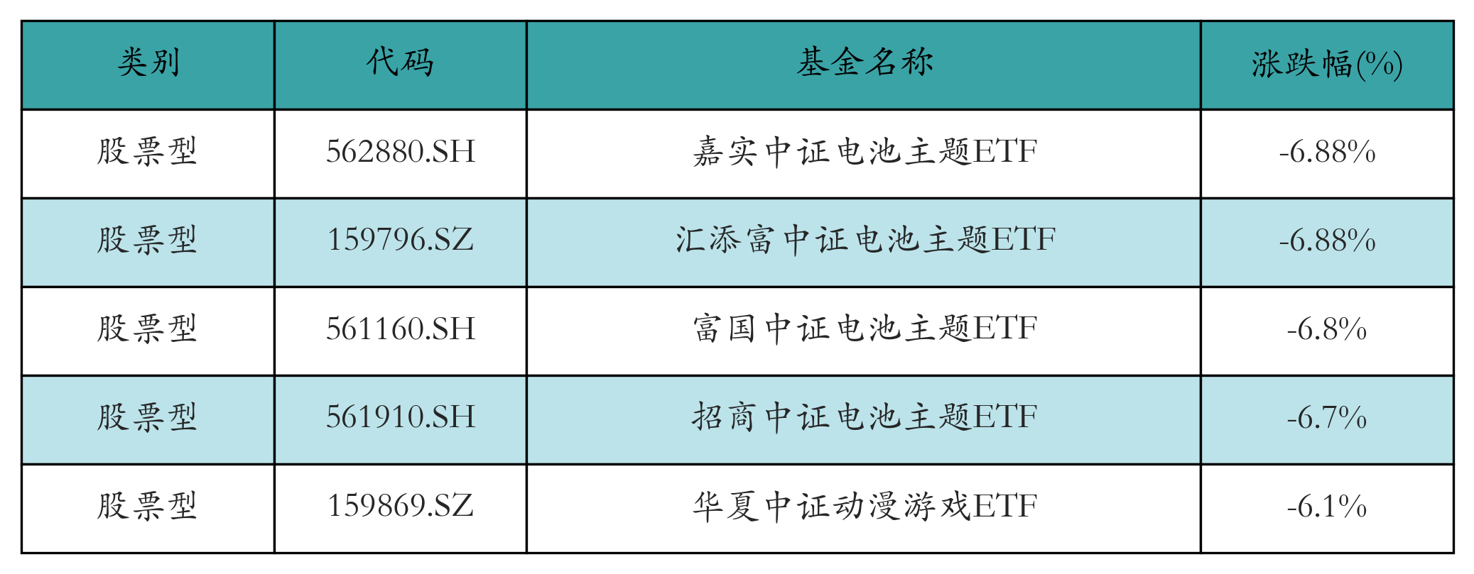 上周股票型ETF跌幅最大的5只ETF及其收益率分别为:嘉实中证电池主题ETF(-6.88%)、汇添富中证电池主题ETF(-6.88%)、富国中证电池主题ETF(-6.8%)、招商中证电池主题ETF(-6.7%)、华夏中证动漫游戏ETF(-6.1%)。详情见下表: