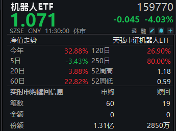 不过,该ETF盘中获资金净申购明显。Wind金融终端数据显示,机器人ETF(159770)早盘获净申购超1亿份。