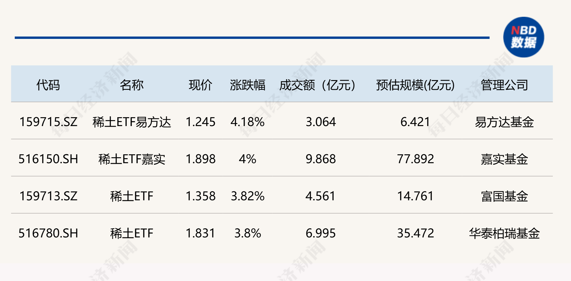 ETF涨幅榜上,稀土概念股早盘表现突出,稀土ETF易方达(159715)、稀土ETF嘉实(516150)上午涨幅达4%,另外2只稀土ETF半日涨幅均超过3%。