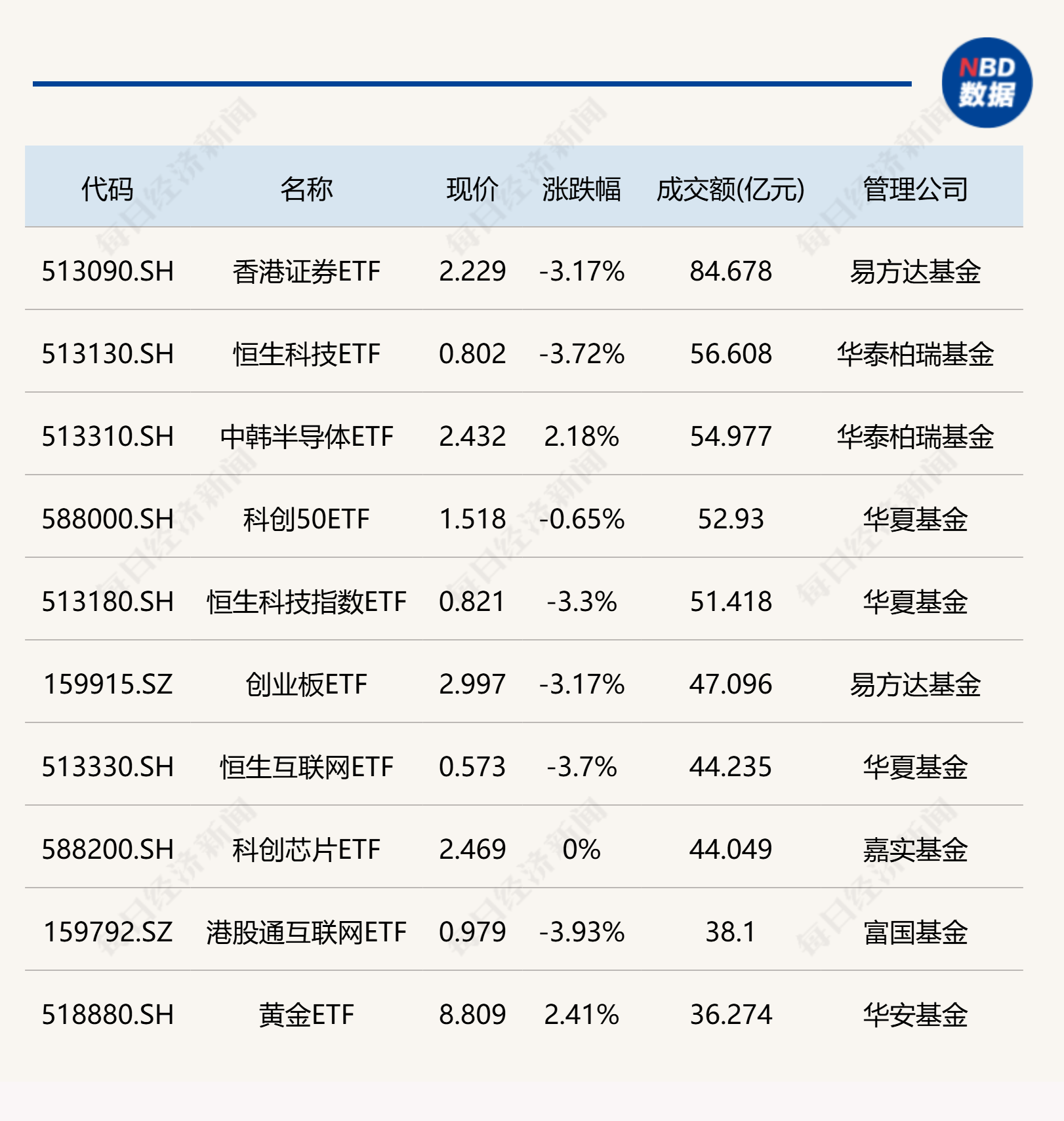 市场早盘震荡回升,三大指数跌幅收窄。香港证券ETF半日成交84.68亿元,交投活跃。此外,中韩半导体ETF、科创50ETF以及2只恒生科技相关ETF早盘成交额突破50亿元。