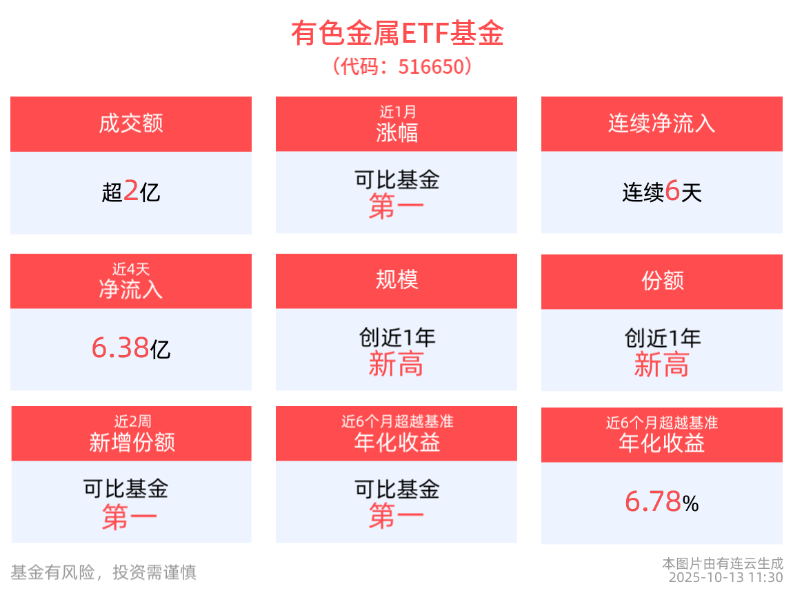 流动值得注意的是,近日,有色金属ETF基金(516650)持续获资金布局,近6日连续获资金净申购,累计吸金6.6亿,截至10月10日,最新份额达9.04亿份,最新规模达15.40亿元,均创成立以来新高。