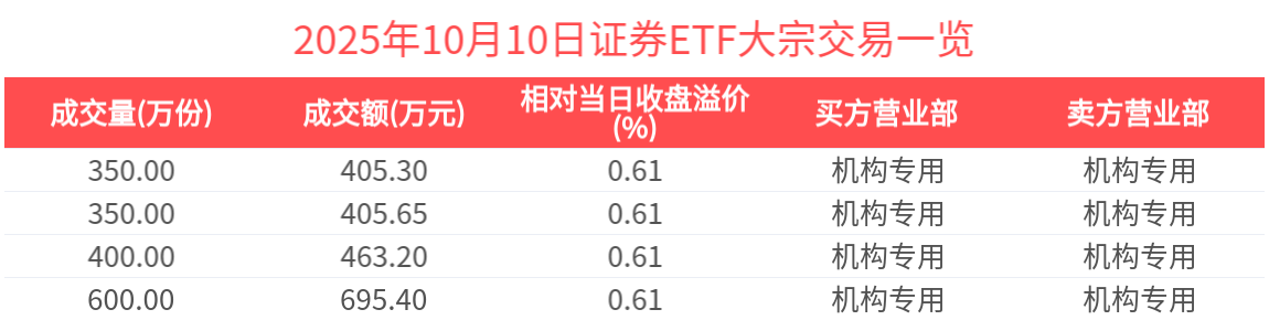 ETF大宗榜 | 证券ETF(159841):获大宗交易溢价买入1969.55万元,居全市场首位-20251010