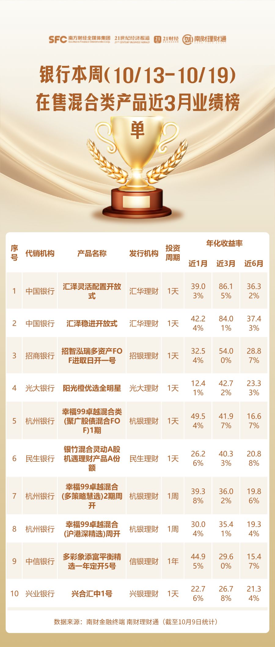 银行渠道本周在售混合类理财产品榜单(10/13-10/19)