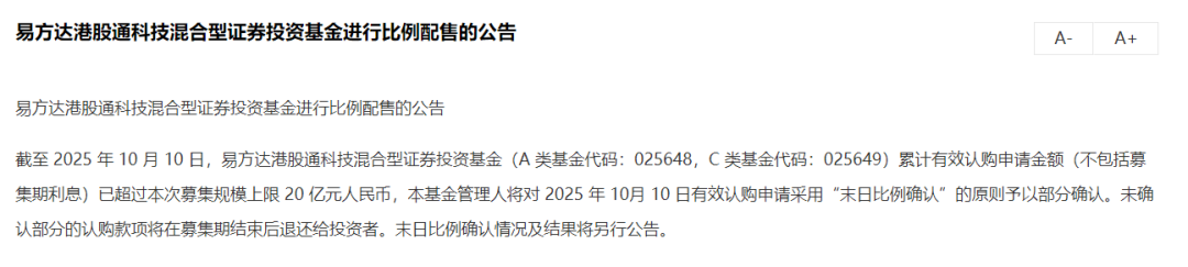 10月11日,易方达基金公告称,易方达港股通科技混合基金自10月9日开始募集,原定募集截止日为10月21日,现将募集截止日期提前至10月10日。该基金累计有效认购申请金额(不包括募集期利息)已超过本次募集规模上限20亿元,将对10月10日有效认购申请采用“末日比例确认”的原则予以部分确认。