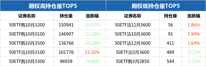 从持仓量来看,50ETF期权合约中,50ETF购10月3200持仓量最大,为150941张,期权全日下跌15.93%,报收0.0095元;持仓量最小的为50ETF沽11月3600,共计56张,期权全日上涨1.86%,报收0.4971元。