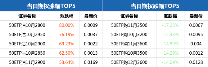上证上证50ETF收跌,50ETF沽10月2800涨幅80.00%