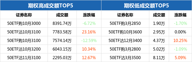 从成交额来看,50ETF期权合约中,50ETF购10月3000成交额最高,为8391.74万元,全日下跌6.72%,报收0.1111元;而最低的为50ETF购3月2850,成交额为1.9万元,全日下跌1.70%,报收0.3295元。