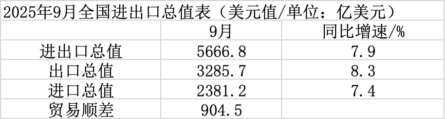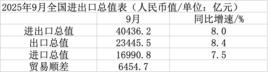 以人民币计,9月中国进出口总值4.04万亿元,同比增长8.0%;出口总值2.34万亿元,同比增长8.4%;进口总值1.70万亿元,同比增长7.5%;贸易顺差6454.7亿元。