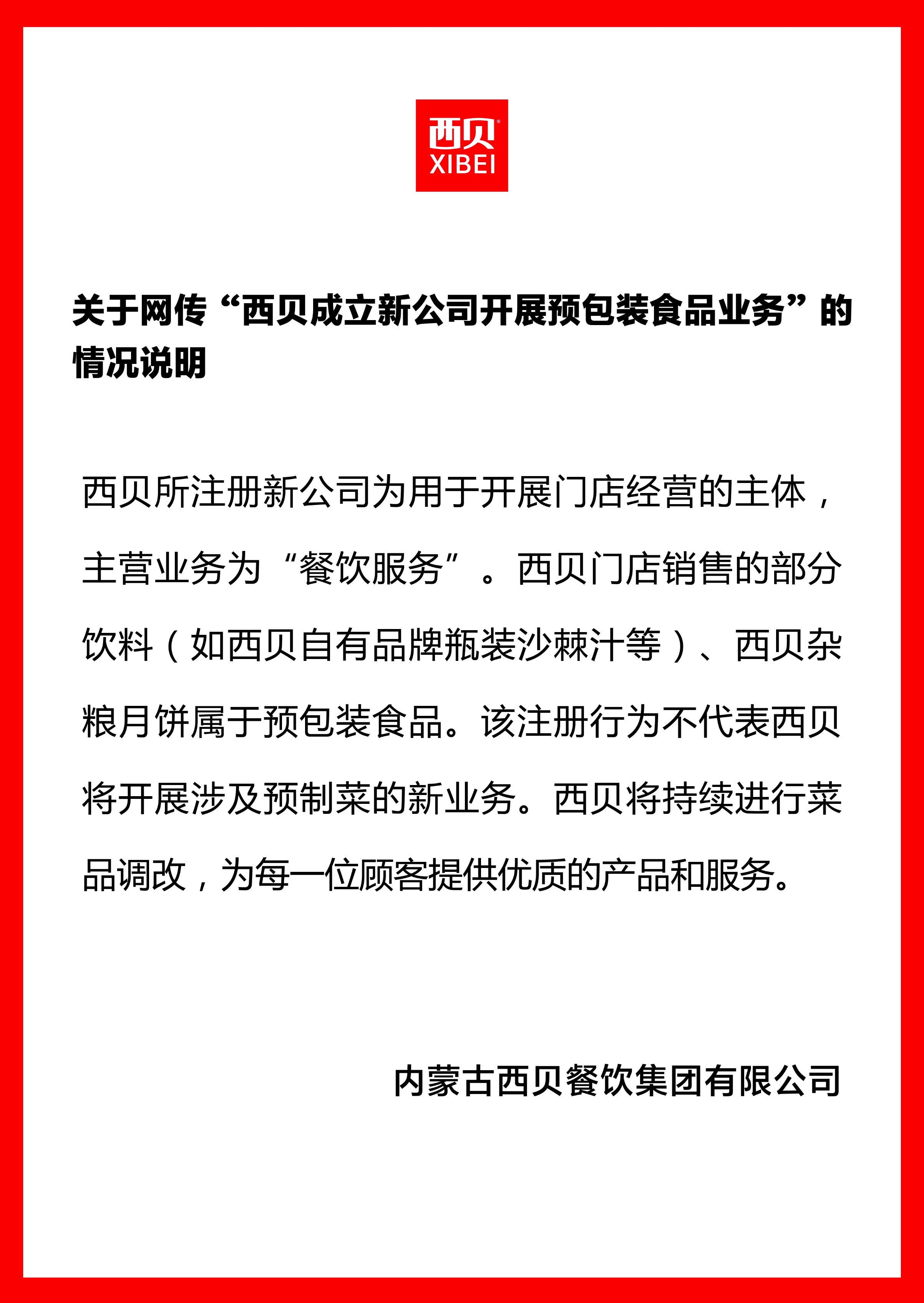 10月13日,有媒体报道称,西贝成立新公司开展预包装食品业务,被视为西贝要卖预制菜。对此,西贝方面回应称,西贝所注册新公司为用于开展门店经营的主体,主营业务为“餐饮服务”。西贝门店销售的部分饮料(如西贝自有品牌瓶装沙棘汁等)、西贝杂粮月饼属于预包装食品。该注册行为不代表西贝将开展涉及预制菜的新业务。