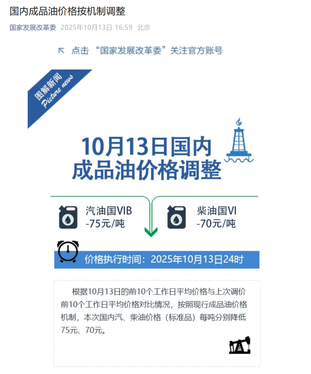 10月13日,国家发展改革委官微发布消息称,根据10月13日的前10个工作日平均价格与上次调价前10个工作日平均价格对比情况,按照现行成品油价格形成机制,本次国内汽、柴油价格(标准品)每吨分别降低75元、70元。价格执行时间为2025年10月13日24时。