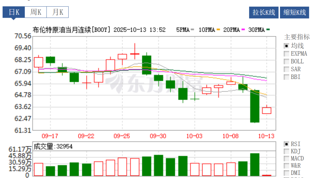 上周,布伦特原油连续合约累计下跌显著;尤其在上周五收盘时,跌幅达到了4.67%,最终定格在每桶65.16美元。这一价位是布伦特原油自今年5月以来从未触及的低点。