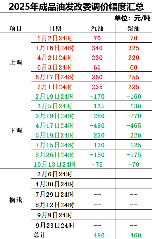 今年以来,国内成品油价格已经历20轮调整,分别为“6涨8跌6搁浅”。涨跌互抵后,国内汽、柴油与年初价格相比分别下跌480元/吨、460元/吨。