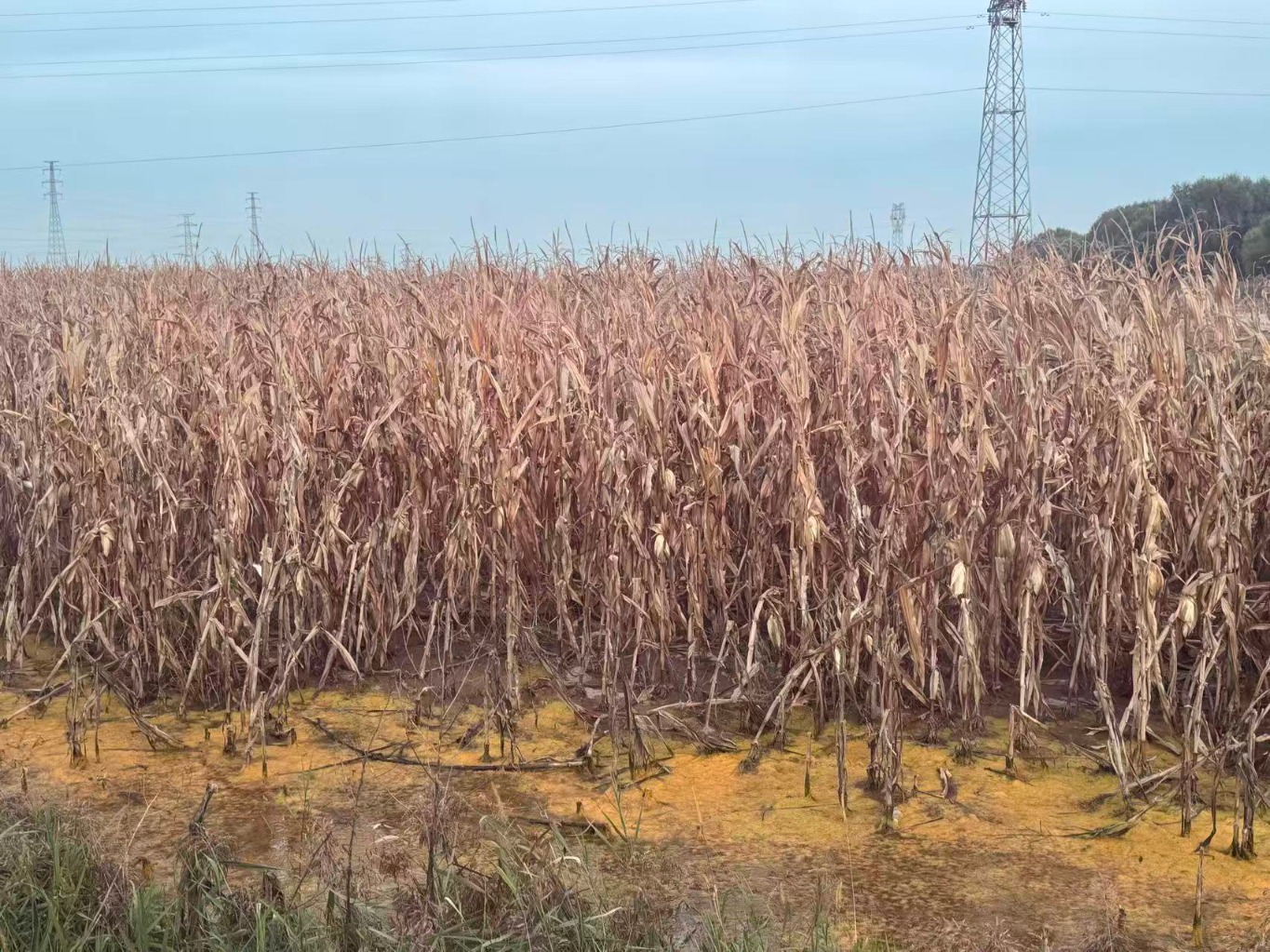 乘车去北什轴乡出彦村的路上,第一财经记者透过车窗,看到道路两旁的田地里满是积水,枯黄的玉米秆泡在水中,向日葵已腐烂成泥,只剩枯萎的根部浸在水中,了无生机。