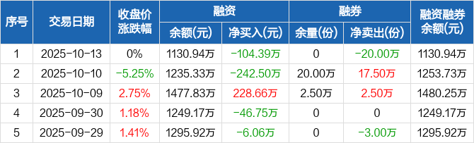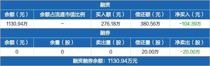 融资方面,当日融资买入276.18万元,融资偿还380.56万元,融资净偿还104.39万元。融券方面,融券卖出0份,融券偿还20万份,融券余量0份,融券余额0元。融资融券余额合计1130.94万元。