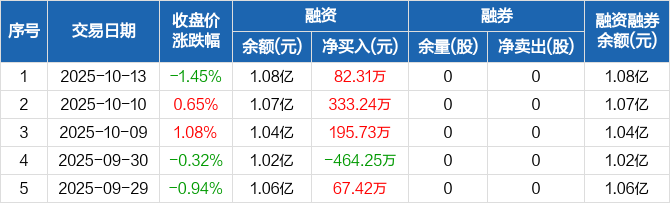融资方面,当日融资买入503.23万元,融资偿还420.92万元,融资净买入82.31万元,连续3日净买入累计611.28万元。融券方面,融券卖出0股,融券偿还0股,融券余量0股,融券余额0元。融资融券余额合计1.08亿元。