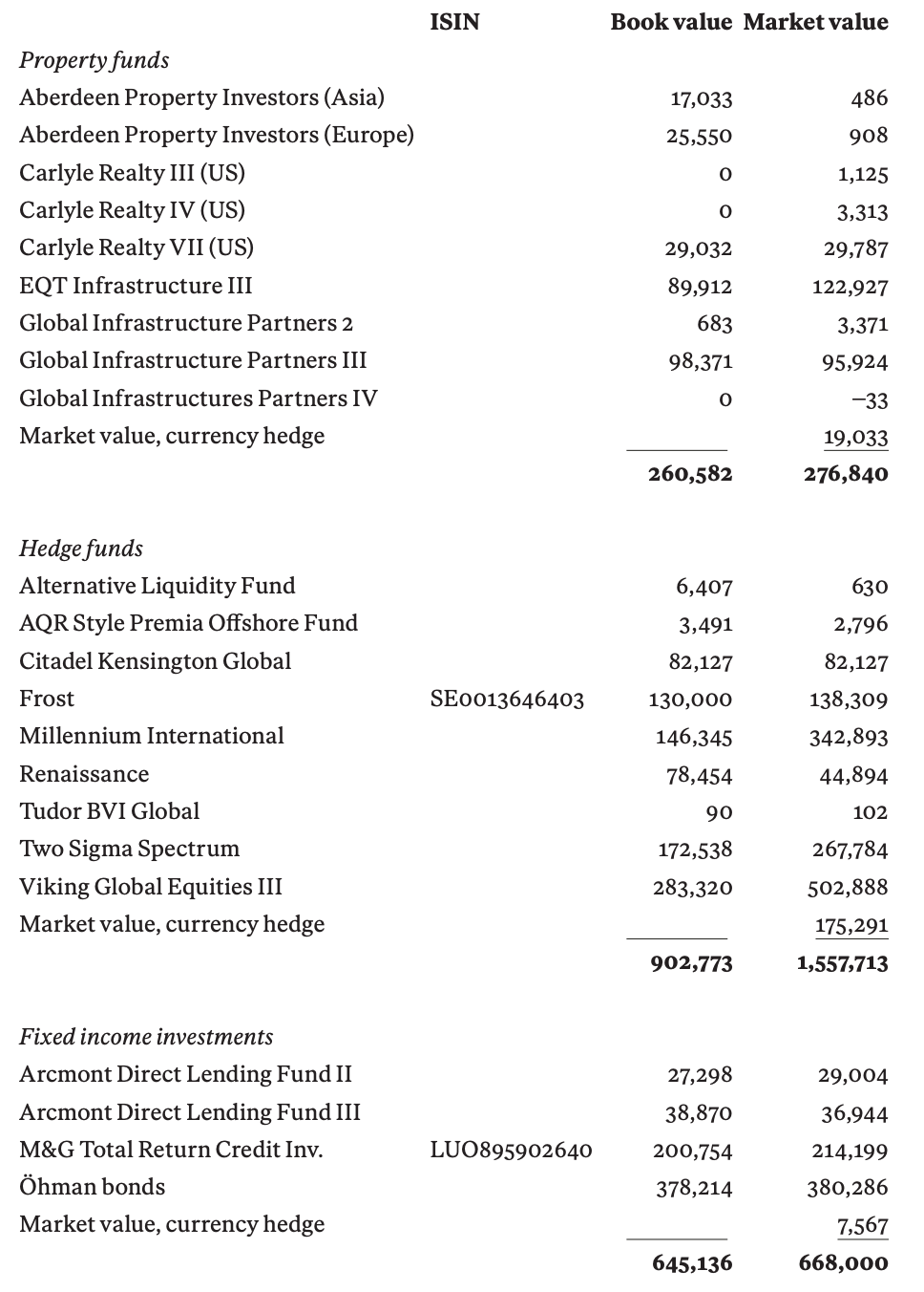 根据诺贝尔基金会2020年报,其外部管理人包括:贝莱德、瑞典商业银行基金公司、世代投资管理、红杉资本、凯雷、瑞典本土资产管理机构欧曼、英国老牌资管机构英卓投资管理、擅长投资亚洲和新兴市场的盈信投资,以及全球顶级对冲基金城堡投资、千禧基金、文艺复兴科技、维京国际投资、Two Sigma、AQR资本等机构。