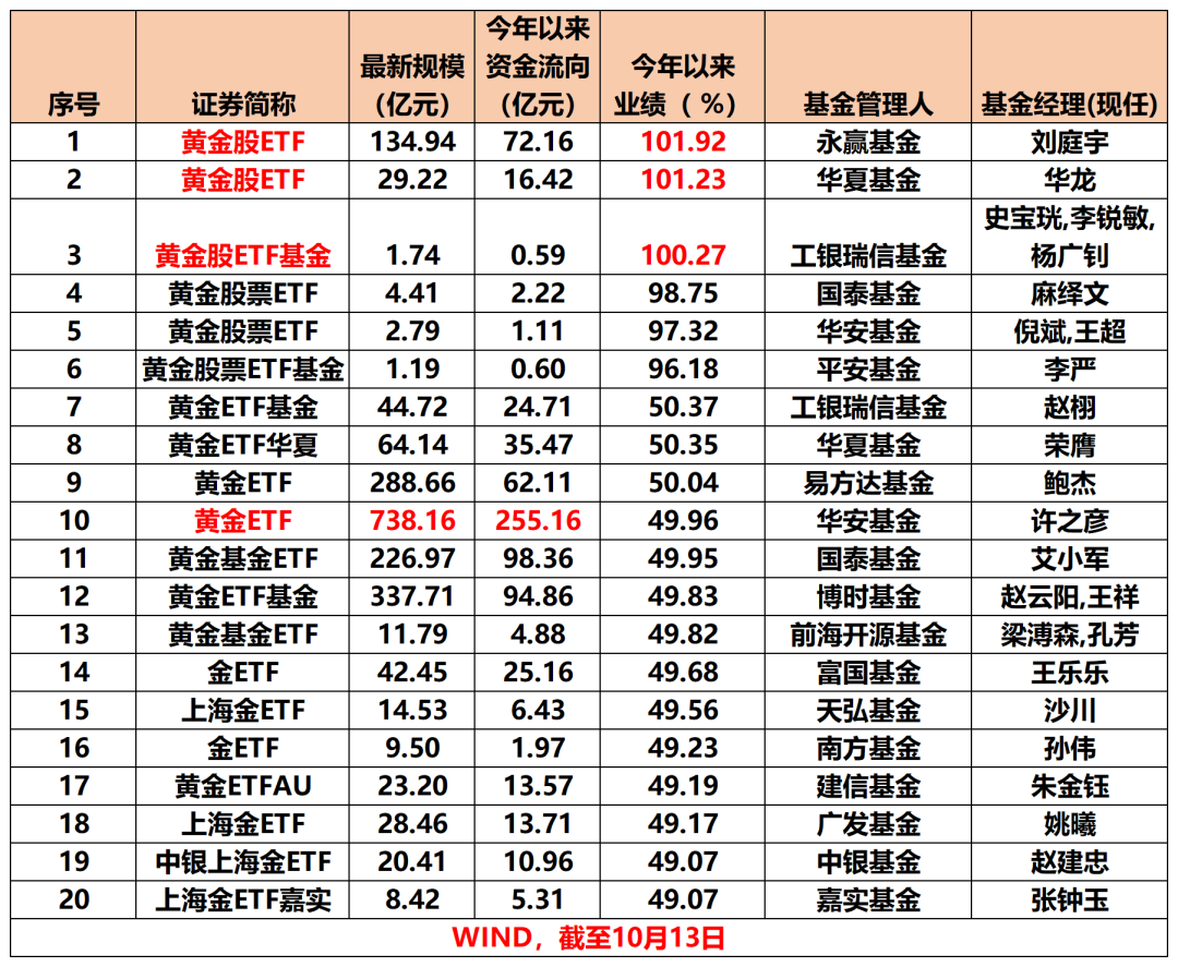 永赢、华夏、工银瑞信基金旗下黄金股ETF成为“翻倍基”;国泰、华安、平安基金旗下黄金股票ETF今年以来业绩均在95%以上。