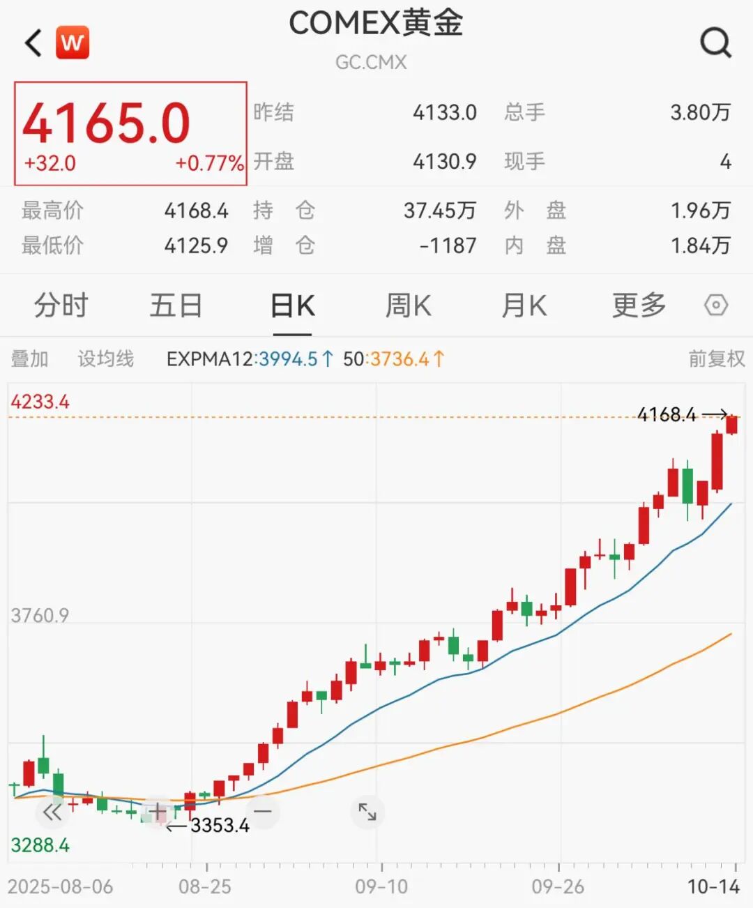 10月14日盘中,国际金价持续拉升,截至发稿,伦敦现货黄金价格站上4140美元/盎司,COMEX黄金期货价格站上4160美元/盎司,续刷历史新高。