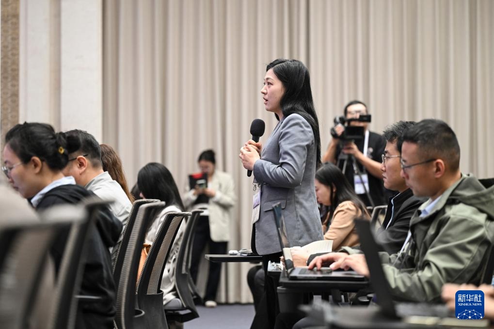 10月14日,国务院新闻办公室在北京举行“高质量完成十四五』规划”系列主题新闻发布会,国家发展改革委党组成员、国家粮食和物资储备局局长刘焕鑫,国家粮食和物资储备局副局长钱毅、副局长秦玉云介绍“十四五”时期粮食流通改革发展成效,并答记者问。这是记者在现场提问。新华社记者陈晔华摄