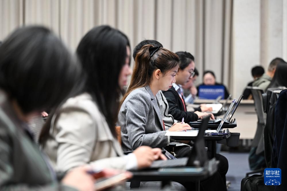 10月14日,国务院新闻办公室在北京举行“高质量完成十四五』规划”系列主题新闻发布会,国家发展改革委党组成员、国家粮食和物资储备局局长刘焕鑫,国家粮食和物资储备局副局长钱毅、副局长秦玉云介绍“十四五”时期粮食流通改革发展成效,并答记者问。这是记者在现场工作。新华社记者陈晔华摄