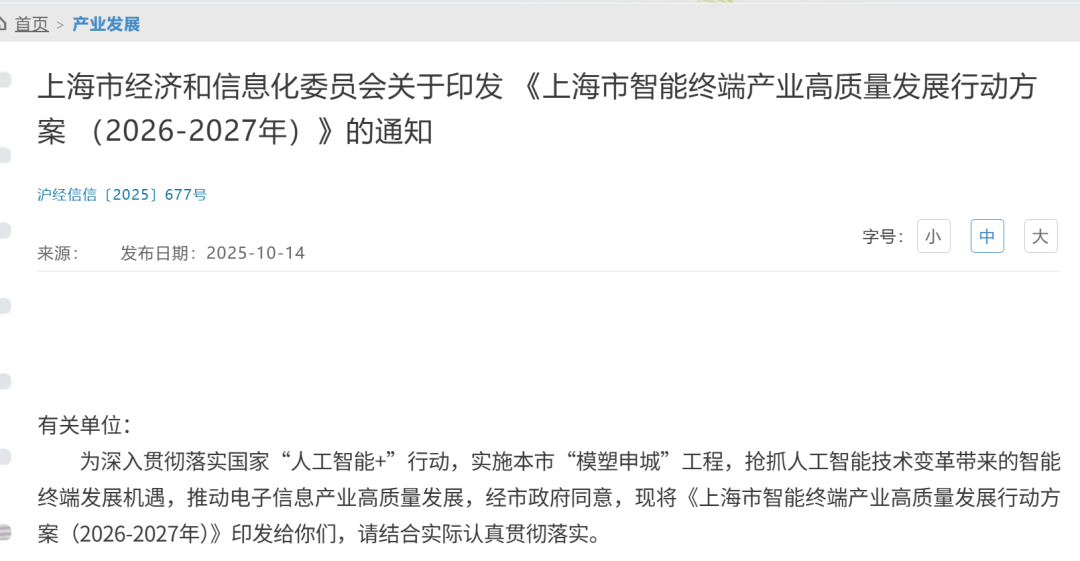 10月14日,上海市经济和信息化委员会印发《上海市智能终端产业高质量发展行动方案(2026-2027年)》。