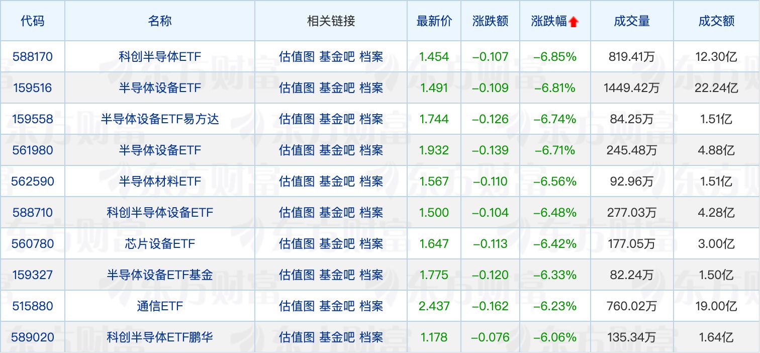 下跌方面,半导体板块集体下跌,闻泰科技一字跌停,半导体相关ETF悉数回调,最高下跌6.85%。