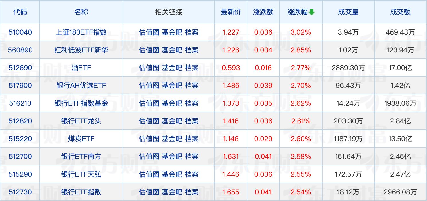 具体来看,上证180ETF指数领涨3.02%,酒ETF、银行相关ETF也有所表现。