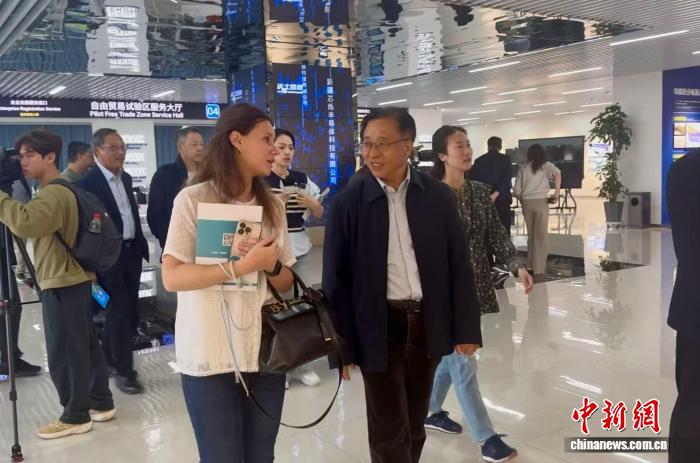 10月13日,“走进新疆,推动新港合作交流”外国驻港领团和商界参访团走进中国(新疆)自由贸易试验区喀什片区。图为中国外交部驻香港特别行政区特派员公署特派员崔建春(右)和白俄罗斯驻港总领事馆副领事达丽娅·博赫丹(左)围绕参访内容进行交流。中新网记者戴小橦摄