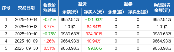 杭华股份:融资净偿还121.93万元,融资余额9952.54万元(10-14)