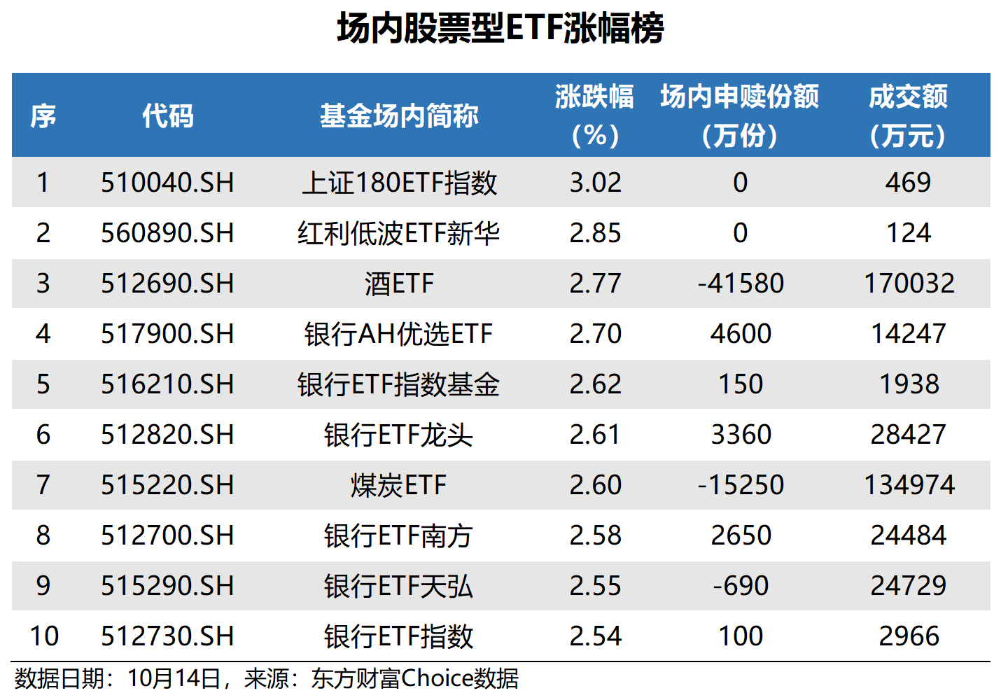 数据显示,昨日场内股票型ETF中,上证180ETF指数、红利低波ETF新华、酒ETF涨幅居前。其中,上证180ETF指数涨幅最大,为3.02%。