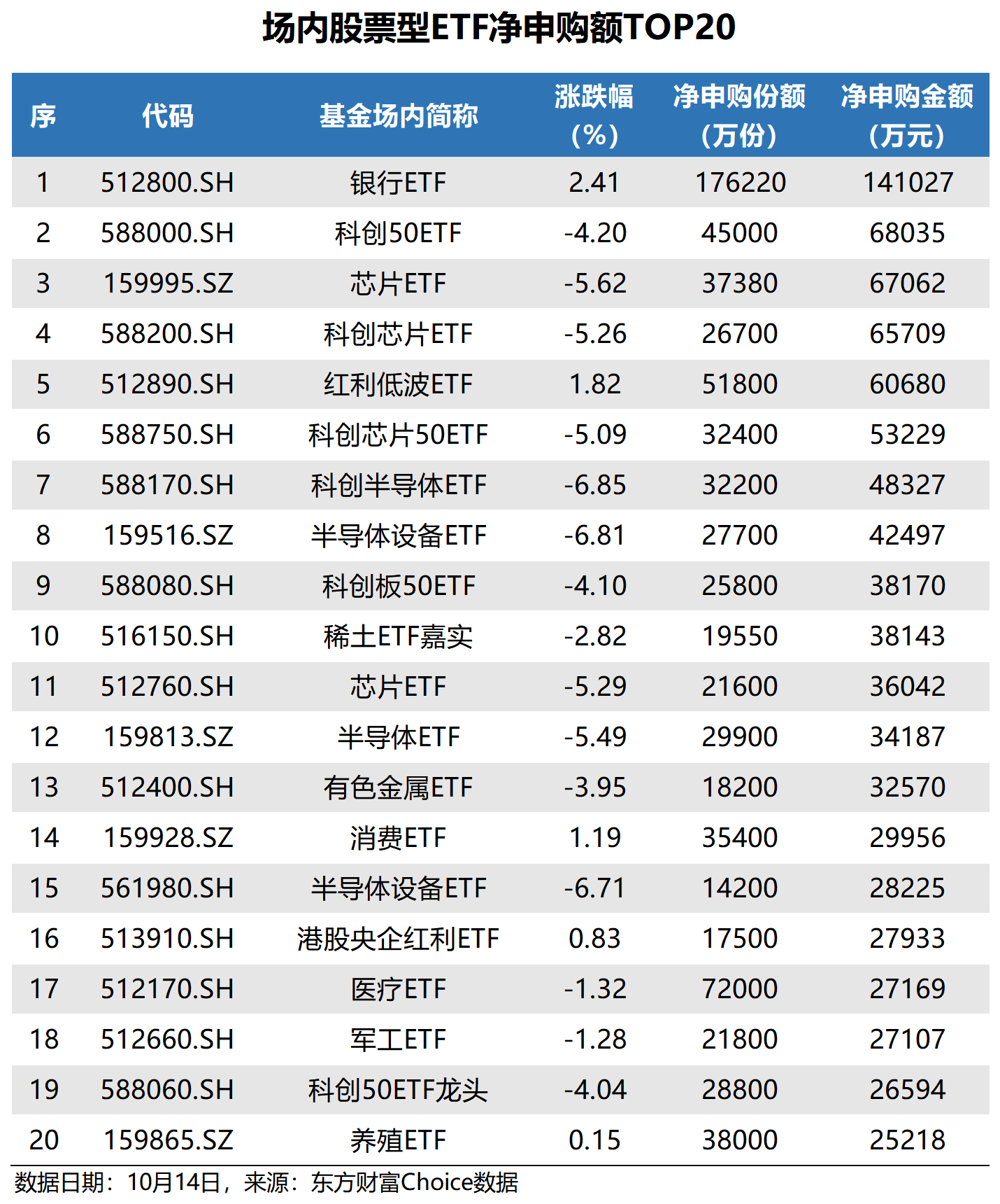 昨日,净申购金额最多的股票型ETF为银行ETF,净申购金额为14.10亿元。此外,科创50ETF和芯片ETF也获购居前,净申购金额依次为6.80亿元和6.71亿元。