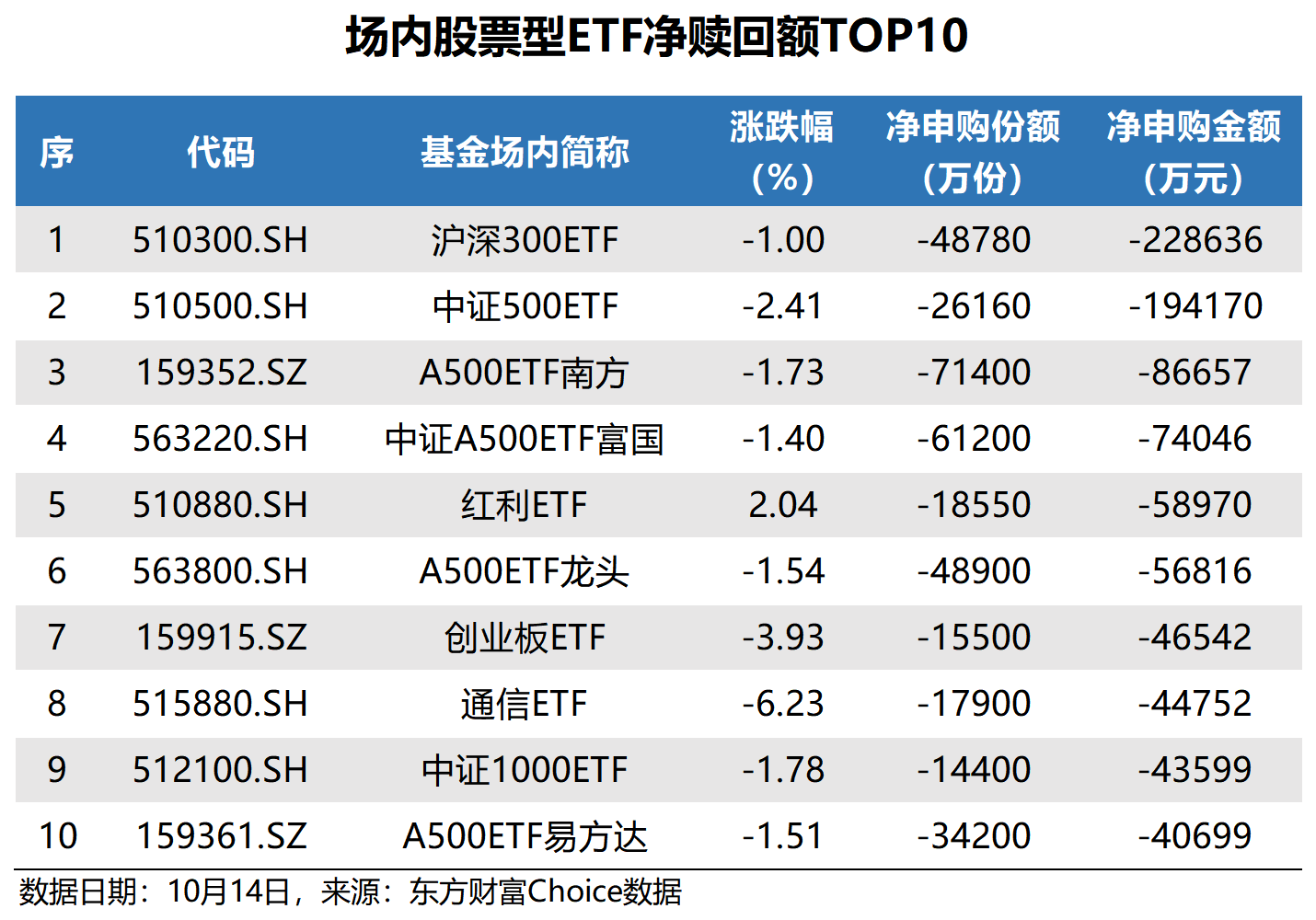 数据还显示,昨日净赎回金额最多的场内股票型ETF为沪深300ETF,净赎回金额22.86亿元;中证500ETF紧随其后,净赎回金额19.42亿元。